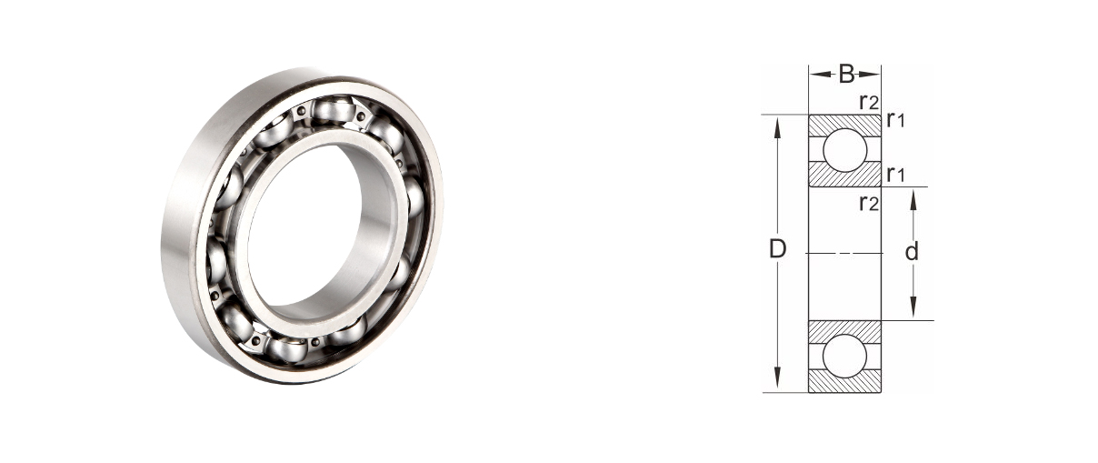 d | D | B | r1,r2 Min | Dynamické zatížení Cr | Statické zatížení Kor | Vazelínové mazání | Mazání olejem | ||